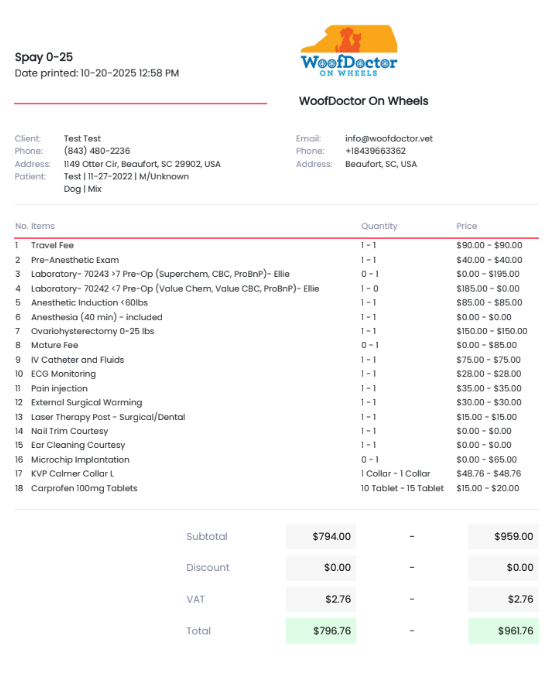 We keep pricing simple and fair—just one travel fee per visit, no matter how many pets we see. Each pet has their own exam fee, and any additional services or medications or are added only if needed, so every pet gets the attention they deserve.