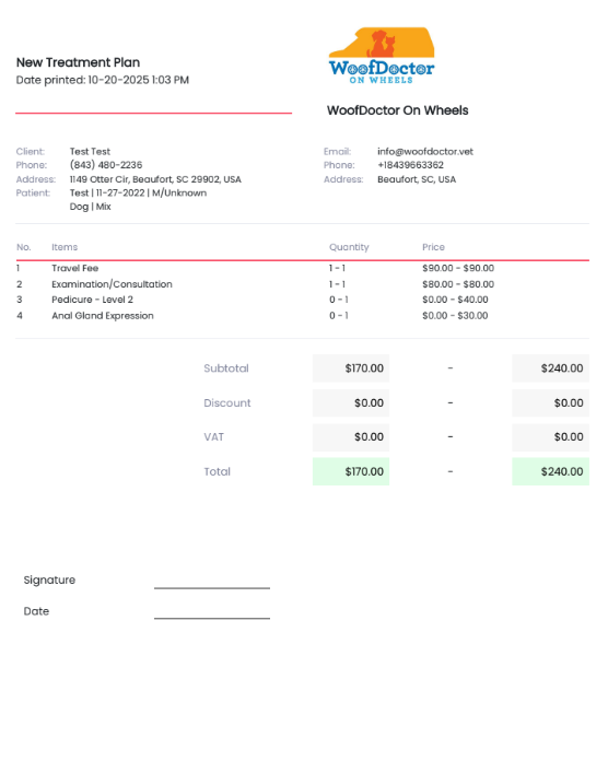 Add-ons are extra products or services, like medications, vaccinations, and diagnostic tests. Any add-ons will be included on your invoice at the end of the visit. For example, add-on during a general exam could be a nail trim, ear cleaning, or medications, while a surgical procedure add-on could be a microchip or histopathology. Please note that costs vary by procedure and are always discussed with you in advance.Why WoofDoctor on Wheels