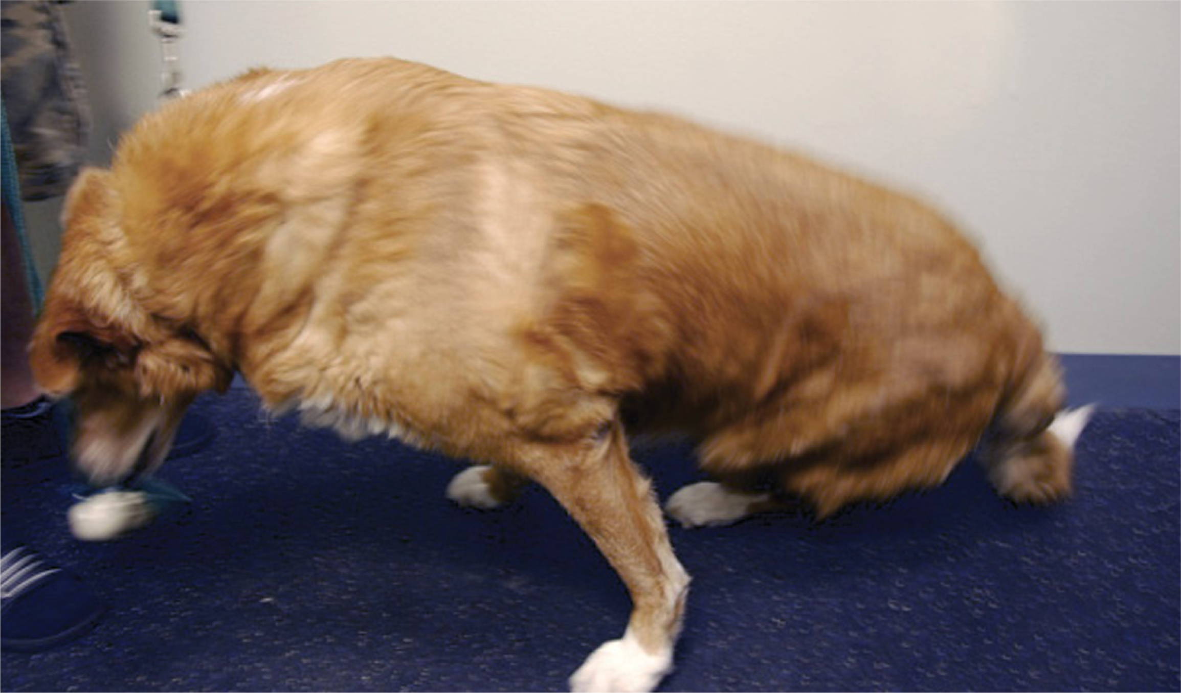 Golden Retriever pulling itself up to a stand by using it's front legs