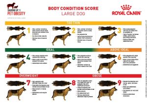 Chart showing Large Dog BCS: 1-3 Thin; 4-5 Ideal; 6 Overweight; 7-9 Too Heavy